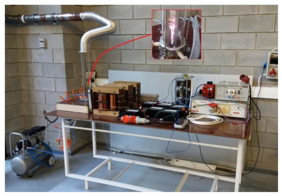 One of the types of plasma reactors is a reactor with arc discharge gliding along electrodes under the technological name GlidArc. Figure 2 presents the installation of a three-phase GlidArc plasma reactor tested in the Department’s laboratory. Reactors of this type are used mainly in the neutralisation of toxic gases, such as SOx and NOx or in other technologies [17,19,20,21,22,23,24,25,26,27,28]. The quasi-arc discharge created in them is a source of non-thermal plasma filling part of the discharge chamber space. The source of plasma and the method of energy supply to it is the forced flow of electric current in gas in the form of an electric arc [15,16,18].