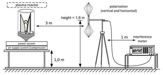 Radiation interference from the plasma reactor was investigated at a distance of 3 m from the installation. The 30 MHz–3 GHz frequency band was analysed. Legal requirements define the band only up to 1 GHz, but the band was increased to 3 GHz. This is because when the reactor is working, the Wi-Fi is not working properly. The measuring system consisted of an interference meter and three measuring antennas.