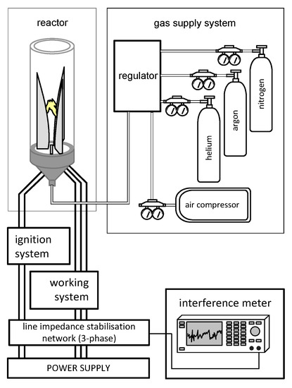 According to the author, the plasma reactor power supply system, the working and ignition path, the discharge chamber, the gas feed system, together with the controls, are an example of a stationary installation that should be tested with a view to ensuring its proper functioning on the European market. According to the Directive [1], a fixed installation means a particular combination of several types of equipment and, where applicable, other devices, which are assembled, installed and intended to be used permanently at a predefined location. Therefore, the measurements of the plasma reactor installation were made at the place of its fixed installation, i.e., in the laboratory of the Department of Electrical Engineering and Electrotechnologies.