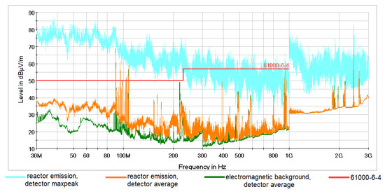 The diagrams in Figure 5 and Figure 6 show the measurement values of the electromagnetic field strength. The measurements were taken from three sides of the stand, and the article contains the results of the largest emission. In the beginning, the electromagnetic background (green curve) was measured with the average detector, when the reactor installation was switched off. External sources such as radio, television (TV), Global System for Mobile Communications (GSM), Universal Mobile Telecommunications System (UMTS), wireless networking technologies (Wi-Fi), Long Term Evolution (LTE) transmitters were observed. In the next step, emission measurements were made when the reactor installation was switched on. The results are from two detectors, maximum (turquoise) and average (orange). Measurements were taken for two polarisations—the horizontal (shown in Figure 5) and vertical polarisation (shown in Figure 6). The graphs show the red limit of IEC 61000-6-4 Generic standards—emission standard for industrial environments.