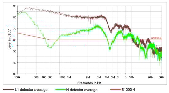 - International Electrotechnical Commission. IEC 61000-6-4, Electromagnetic Compatibility (EMC) – Part 6-4: Generic Standards—Emission Standard for Industrial Environments (Standard of International Electrotechnical Commission); International Electrotechnical Commission: Geneva, Switzerland, 2018. [Google Scholar]