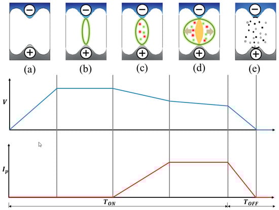 Mechanism of the material-removal rate in electrical discharge machining (EDM): (a) the pre-ignition phase; (b) the ignition phase; (c) the plasma formation; (d) the discharge phase; and (e) the ejection phase.