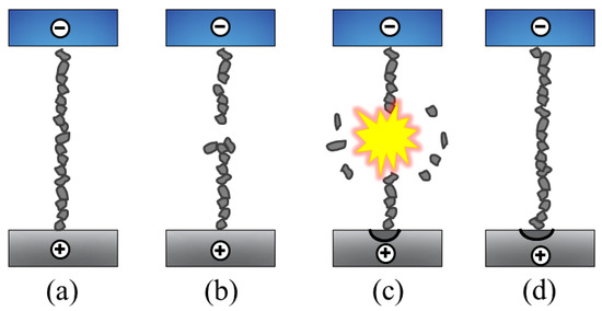 Mechanism of powder-mixed EDM: (a) the bridge formation; (b) the spark initiation of because of the breakage of chain; (c) the explosion leading to zigzag particle motion and (d) the re-bridging.