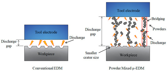 The utilization of powder-mixed dielectric in EDM started in 1980 [26]. Semi-conductive powder was introduced into the dielectric fluid to improve the material-removal rate and surface quality of the workpiece machining [32,33]. Figure 2 explains the mechanism of powder-mixed EDM. The same method was applied to μ-EDM processes, which has similar characteristics to that of EDM [28,34]. However, there are some differences between the two in terms of the size of tool electrodes and discharge energy [35]. The differences yield different effects, where a certain powder size which gave optimum results in EDM may not provide the same result in μ-EDM. In addition, the introduction of powder in μ-EDM requires a full understanding of the mechanism and the machining performance of the powder based on their mechanical properties.
