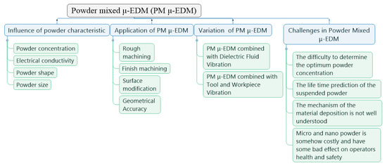 This paper divides the research and development of power-mixed μ-EDM into four sections: powder characteristics, applications of power-mixed micro-electric discharge machining (PM μ-EDM), the variations of PM μ-EDM and the challenges of PM μ-EDM, as shown in Figure 4.