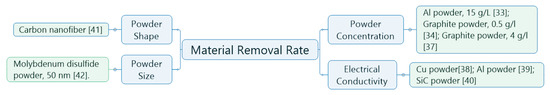 Prihandana et al. [52] observed the introduction of molybdenum disulfide (MoS2) powder at sizes 2 μm, 50 nm and 10 nm in the dielectric fluid, respectively. They found that at a powder concentration of 5 g/L, MoS2 with 50 nm size produced a better surface quality of microholes in Inconel 718, without leaving any black traces or cones in the center of the hole. Furthermore, compared to the other powder sizes (10 nm and 2 μm), 50 nm MoS2 powder was the best size to achieve the highest material-removal rate. An insignificant impact in material-removal rate was provided by the 10 nm MoS2 powder, whilst the 2 μm MoS2 powder was not suitable for μ-EDM due to the discharge gap distance in the conventional μ-EDM being only in the range of a few microns [53]. Figure 6 and Figure 7 summarize the influence of powder properties on enhancing material-removal rate and the surface quality of the machined workpiece.