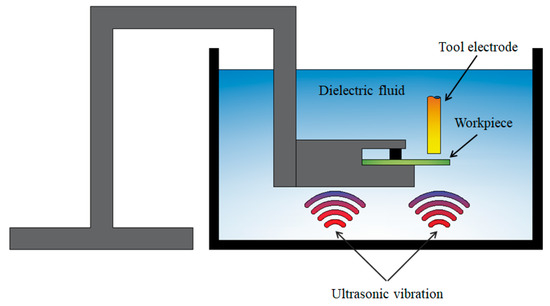 Among the problems of having powder in the dielectric fluid are the sedimentation and agglomeration of powder during the machining process. A stirrer is used to prevent powder deposition in the bottom of the dielectric fluid tank. However, this method was not efficient enough to prevent the agglomeration of the powder and to remove the debris from the machining area. Prihandana et al. [76] introduced micro-MoS2 powder and applied ultrasonic vibration in the dielectric fluid to improve the material-removal rate without sacrificing the surface quality, as illustrated in Figure 9. The Taguchi statistical method was employed to determine the optimal process parameters in having a high material-removal rate. Based on a Taguchi analysis, the ultrasonic vibration of dielectric fluid is essential in improving material-removal rate and the quality of the surface machined. The vibration in dielectric fluid at the ultrasonic level reduced the adhesion of the workpiece and prevented the agglomeration and deposition of MoS2 powder in the bottom of the tank.