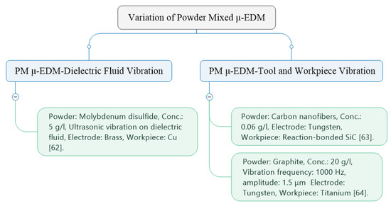 In recent years, researchers have been developing a method to improve the performance and machining efficiency of μ-EDM [30,31]. Some of these methods are utilizing high electric resistance electrodes, vibration-assisted μ-EDM and the utilization of powder-mixed dielectric in μ-EDM.