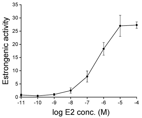 Datasets were obtained in triplicate, calculated, and analyzed using the Excel® software (Microsoft Corporation, WA, USA) and plotted using Sigma Plot (SPSS Inc., San Jose, CA, USA). The results were reported as mean ± standard deviation. Analyses of variance (one-way ANOVA), followed by Dunnett’s test as a post hoc test, were performed for the estrogenic activity test and the viability test. The differences were considered significant at p-values < 0.05.