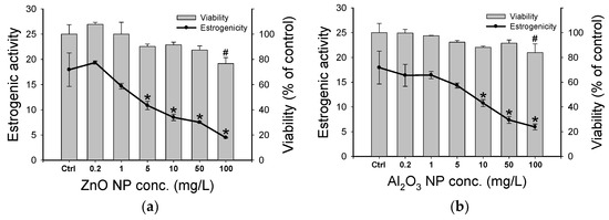 Figure 2 shows the effects of NPs on the viability and the activity of E2 in the yeast two-hybrid system. When compared to control, no significant difference was observed in the viabilities of yeast cells exposed to ZnO NP and Al2O3 NP, except for 100 mg/L (Figure 2a,b). However, E2 estrogenic activities began to decline at 5 mg/L of ZnO NP and 10 mg/L of Al2O3, respectively. With the 50 mg/L NPs, the estrogenic activities were about 40%, compared to the control. Ag NP did not induce any significant difference in the viability and the estrogenic activity of E2 in yeast cells up to a concentration of 0.1 mg/L (Figure 2c). However, with 0.5 mg/L Ag NP, the viability and estrogenic activity significantly decreased (p < 0.05) in comparison with control. For Agcit NP, the mortality increase was slower than that with Ag NPs, and estrogenic activity was inhibited at a concentration of 10 mg/L and above (Figure 2d).