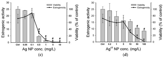 Viability and estrogenic activity of yeast exposed to (a) ZnO NP, (b) Al2O3 NP, (c) Ag NP, and (d) Agcit NP, in combination with 10−6 M E2. Asterisks for estrogenic activity test and pounds for viability test indicate a significant difference relative to the control (p < 0.05), using Dunnett’s post hoc test.