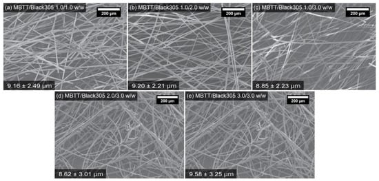 In the centrifugal spinning process, the morphologies of the obtained fibers were significantly affected by various parameters. In the previous study, the bead-free fibers were successfully prepared using the following spinning conditions: PS/THF ratio of 10.0/35.5 w/w, rotational speed of 15,000 rpm, needle inner diameter of 160 µm, and collection distance of 10 cm []. The dependence of the Black305 concentration on the fiber morphology and fiber diameter was evaluated based on the above spinning conditions. Three kinds of PS solutions were prepared by fixing the MBTT concentration to 1.0 by weight and varying the Black305 concentration, as listed in Table 1. Figure 1 shows the SEM images and the fiber diameters of the composite fibers prepared in the conditions specified in Table 1. The viscosities of the PS solutions with the different concentrations of Black305 were in the 148–150 mPa s range. The viscosities of the polymer solutions were not significantly affected by the concentration of the added Black305, and the composite fibers prepared with these PS solutions show approximately the same diameter of 9 μm. Moreover, each of the obtained composite fibers is a bead-free fiber, indicating that the PS solutions during the centrifugal spinning process did not exhibit the Plateau–Rayleigh instability when ejected from the nozzle, suggesting a cylindrical polymer jet []. The effect of the increasing concentration of MBTT on the morphology and sensitivity for the fibrous color dosimeters was also investigated. The concentration of Black305 was fixed at 30 wt% and three PS solutions with different MBTT concentrations were prepared. The measured viscosities of the PS solutions with different MBTT concentrations were in the range of 149–151 mPa s. These results indicate that the fiber diameters of the composite fibers are controlled predominantly by the viscosity of the PS solutions, implying that the additives, such as Black305 and MBTT, are uniformly dispersed in the composite fibers. The viscosities of the PS solutions and the fiber diameters for the obtained composite fibers are summarized in Table 1. The ATR-FTIR spectra of the composite fibers show that composite fibers prepared by the centrifugal spinning method consists of MBTT and Black305 (Figure S2).