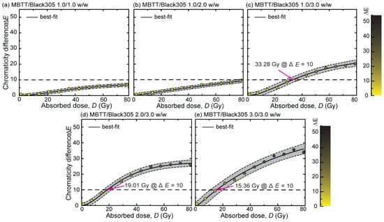 The dose-response curves for the fibrous color dosimeters based on the composite fibers with the different Black305 concentrations were obtained by plotting the chromaticity difference (ΔE) versus the exposure dose at an exposure rate of 0.71 Gy min−1. All of the experimental assays were performed at room temperature (RT; 20 °C). The obtained plots are shown in Figure 2. The X-ray dosages in these plots were determined using the Fricke solution. The grey areas on the curve indicate the maximum and minimum values of the error. In this study, we defined the maximum sensitivity as the chromaticity difference of 10 or higher because the color changes of 10 or higher can be recognized by the naked eye. The change of color is based on the chromaticity difference ΔE with respect to the exposure dose; all of the fibrous color dosimeters exhibited a good response. However, the ΔEs of the fibrous color dosimeters prepared using the composite fibers with the low concentrations of Black305 corresponding to the MBTT/Black305 1.0/1.0 and 2.0/2.0 w/w samples were insufficient, because the obtained ΔE values are below 10 at any dosages, meaning these color changes color cannot be visually identified in this region. On the other hand, based on the sensitivity criterion, a sufficient sensitivity of 33.28 Gy @ ΔE = 10 was obtained for the fibrous color dosimeter with the MBTT/Black305 ratio of 1.0/3.0 w/w. Consequently, it is suggested that the Black305 concentration should be at least 30 wt% for the MBTT concentration of 10 wt% for recognizing the color change of the fibrous color dosimeter. In addition, an examination of the morphologies of the composite fibers also shows that these fibers are bead-free, as was found for the experiments in which the dependence on the Black305 concentration was examined. These results suggest that the viscosity of the PS solution controls the fiber morphology regardless of the concentrations of Black305 and MBTT. When the fibrous color dosimeters obtained using increased concentration of MBTT were examined, it was found that the rise of the dose-response curves was improved, and as a result, the sensitivity was successfully improved to 15.36 Gy @ ΔE = 10. It is suggested that this improvement in sensitivity is based on the reaction mechanism described below that was first described in our previous study []. A kinetic model considering a two-step consecutive first-order reaction for the color-changing in this fibrous color dosimeter was proposed as follows