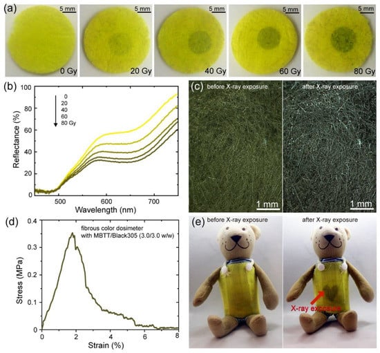 We conducted a preliminary experiment of X-ray exposure visualization using a fabric based on the fibrous color dosimeter (3.0/3.0 w/w), which presents photographic images of color changes during X-ray exposure at room temperature (RT; 20 °C). The leftmost photograph in Figure 3a shows the fabric before X-ray exposure. The color of the fabric before X-ray exposure is based on the absorption characteristics of MBTT. The circular black colors on the fabrics indicate the actual color change due to the X-ray exposure, and the dose dependence of the coloration is shown in Figure 3b. In addition, the black circles on the fabrics completely trace the shape of a window formed on a lead plate placed on the fabric. Figure 3b exhibits the UV−visible reflectance spectral changes of the color of the fabric during X-ray exposure at an interval of 20 Gy. Before the X-ray exposure, the broad reflection band where the reflection bands of PS and MBTT overlap appears in the region <532 nm. Under X-ray exposure, the color of the fabric gradually changes to black, and the reflection spectra with a peak of 610 nm are attributed to the colored zwitterionic form of Black305 []. Consequently, the reflectivity of the fabric changed drastically from 58% for yellow to 32% for black. Photographs of the fabric before and after an X-ray exposure dose of 80 Gy are presented in Figure 3c. An important property of the fabric is that its color changes can be uniformly confirmed as a whole, which indicates that the MBTT and Black305 dispersed entirely and would not form aggregates in the fabric. For future applications on the personal wearable dosimeter, the mechanical properties of the fabric were investigated as well. The mechanical properties of the fabric must be strong enough to build a wearable device. Figure 3d shows the stress–strain curve of the fibric. As a result, the maximum tensile stress and elongation at maximum tensile stress for the fabric are 0.36 ± 0.01 MPa and 1.3 ± 0.4%, respectively, and the properties are consistent with a nonwoven fabric derived from PS fibers []. Therefore, the mechanical strength of the fabric has a sufficient performance as a wearable dosimeter. Finally, a practical demonstration of X-ray visualization using the fabric that was processed into an apron is presented in Figure 3e. We put the fibrous color dosimeter apron on a teddy bear and placed it in inside the X-ray exposure apparatus. Then, we put a lead plate with a “♥” shape hole on the teddy bear to distinguish the contrast between the exposed area and unexposed one. As shown in Figure 3e, the black heart shape area shows the area exposed to 80 Gy of X-ray radiation, and the yellow is the unexposed area.