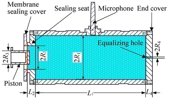 A membrane sealing structure-based pistonphone is designed, as shown in Figure 2 [28]. The cavity is sealed by a silicone membrane, and the piston drives the membrane to vibrate. The cavity wall is made of a seamless steel tube, thus satisfying the rigid wall condition, and produces stable heat conduction. A tiny equalizing hole is opened at the end cover to achieve a static pressure equilibrium. The lower limiting frequency of the pistonphone is about 0.01 Hz and can be further extended by replacing the equalizing hole. All the specific parameters are given in Table 1.
