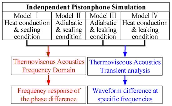 In the calibration process, except at constant amplitude and zero initial phase with frequency-varying piston displacement excitation, there are pressure leakage, heat conduction, and wave motion effects that affect the phase response between the calibrating sound pressure and the piston displacement. Therefore, four models corresponding to the heat conduction and sealing condition, adiabatic and sealing condition, adiabatic and leaking condition, and heat conduction and leaking condition are respectively established in COMSOL 5.3, as shown in Figure 3. The thermoviscous acoustics modules of both the frequency domain and the transient analysis are used to respectively get the frequency response of the phase difference and the waveform difference between the calibrating sound pressure and the piston displacement [29].