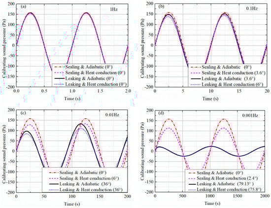 Let us analyze the first three quarters of the first period of the leaking and heat conduction model at 0.001 Hz, as shown in Figure 6d. When the piston sinusoidally moves to its positive extreme position, the increase in the generated sound pressure slows down, and the severe pressure leakage effect causes it to decrease to 0. When the piston moves from this positive extreme position to the negative position, the air would all along be expanded from zero to negative pressure and would have no relation to the equilibrium position of the piston. Therefore, the phase lead of the calibrating sound pressure to the piston displacement occurs.