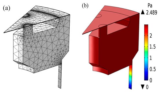 (a) The FEA model of the pistonphone. (b) Sound pressure distribution for the heat conduction and leaking condition at 0.1 Hz.