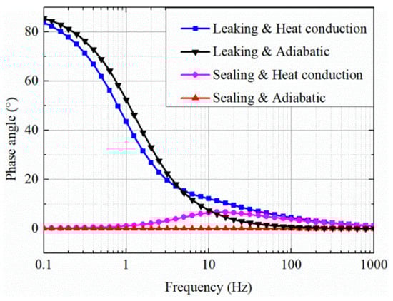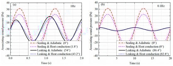 As shown in Figure 5, in the ideal sealing and adiabatic conditions the generated sound pressure is exactly synchronized with the piston displacement. The heat conduction effect will cause the phase of the sound pressure to be ahead of the piston displacement, and it works only at middle frequencies. Meanwhile, the effect of the pressure leakage acting on the sound pressure is more obvious and will cause the sound pressure to be 90° ahead of the piston displacement.
