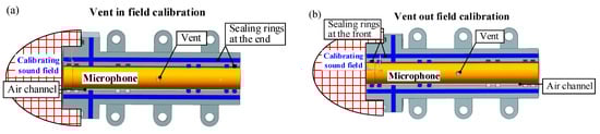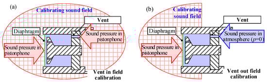 In addition, depending on whether the vent of microphone is installed in or out of the calibrating field during calibrations, as shown in Figure 11, the calibration results will be very different. Thus, these two calibration states are studied. For vent in field calibrations, the sound pressure in the pistonphone is quite uniform at low frequencies, so that the incident sound pressure on the diaphragm and the outer end of the vent are both the calibrating sound pressure obtained from the independent pistonphone simulation. Meanwhile, for vent out field calibrations the incident sound pressure on the outer end of the vent is 0.