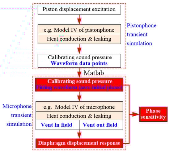 The joint simulation in the time domain needs to apply the time-varying calibrating sound pressure, as shown in Figure 6, to the microphone diaphragm. The sound pressure has not only an amplitude attenuation but also a phase lead against the piston excitation. Since the phase sensitivity is the time difference between the calibrating sound pressure and the microphone voltage, the initial phase of the sound pressure needs to be wiped off. Therefore, the corrected waveform of the sound pressure is fitted to the spline curve and then added to the microphone diaphragm to conduct the simulation. The flow chart of the time domain joint simulation is shown in Figure 13.