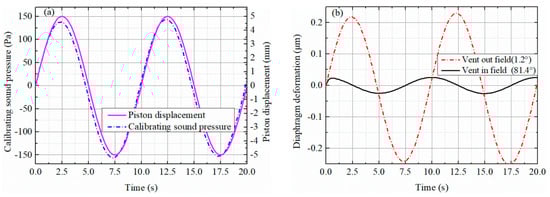 An independent pistonphone simulation at 0.1 Hz is first conducted to obtain the waveform of the piston displacement and the calibrating sound pressure, as shown in Figure 15a. Secondly, the fitting waveform of the calibrating sound pressure is added to the microphone diaphragm and microphone simulations in both the vent in field and vent out field states are conducted. The diaphragm deformation of the microphone in the two venting states is shown in Figure 15b.