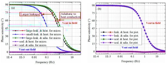 Firstly, the influence of the microphone geometries on the phase sensitivity of the microphone is studied, as shown in Figure 16a, while the pistonphone model adopts more realistic heat conduction and leaking conditions. The sealing features of the microphone are labeled as sealing (seal.), small leaking (small-leak.) and large leaking (large-leak.). Meanwhile, the heat conduction features are labeled as adiabatic (adia.) and heat conduction (heat.).