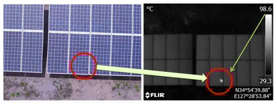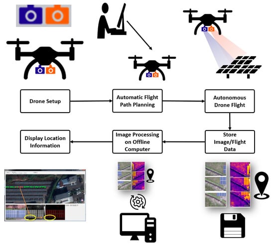 Therefore, regular inspection of PV modules is critical for maintaining an optimal output efficiency. Methods for PV module inspection include manual inspection, laser detection [3], satellite observations [4,5], infrared thermography, and electroluminescence imaging [6,7,8]. Manual inspection is highly time inefficient while laser detection and electroluminescence imaging cannot be applied to PV power stations. Infrared thermography gained significant attention due to its ease of use and applicability to large-scale PV systems. In infrared thermography, a technician usually inspects each PV module with a handheld infrared camera. Inspecting a single PV module is effortless; however, inspecting a large-scale PV system is a considerably lengthy procedure because large-scale PV systems consist of hundreds or thousands of PV modules. In the last few years, the academic and industrial communities are interested in time efficient drone-based infrared thermography methods. Typically, a drone equipped with thermal camera is operated wirelessly by a technician and images are captured and saved during the flight, which are later processed for fault detection. Most previous drone-based approaches [9,10,11] require manual drone control, which is an exhausting procedure since it involves manual labor. In addition, previous works [12,13,14] are unable to provide the exact locations of the defective solar panels, which further delays the recovery process.