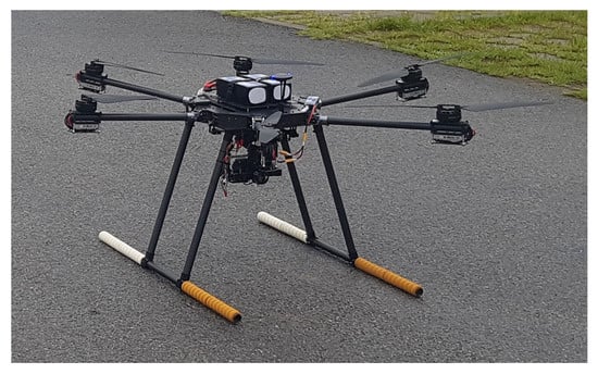 We developed a gimbal-equipped drone based on the Pixhawk 2.1 flight controller. A dedicated ground control station (GCS) program was also developed based on C Sharp. The drone is a 1.1-m hexacopter class drone which can carry a payload of 2 kg and has a flight time of 20 min. A XEON 6S 22,000 mAH high voltage lipo battery with twelve supporting motors was selected, having two serial connections. It holds a higher voltage charge per cell, which results in more potential power for the drone and improves the flight time efficiency by 20%. A picture of the designed drone and a block diagram of our drone system are shown in Figure 2 and Figure 3, respectively. The drone consists of the three main components: