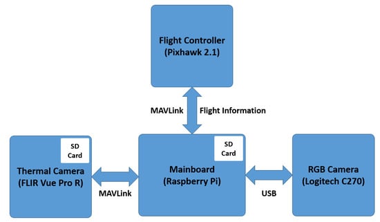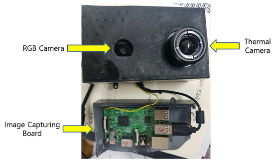 The dual camera system consists of a FLIR Vue Pro R thermal camera and a Logitech C270 RGB camera, as shown in Figure 4. FLIR Vue Pro R has a sensor resolution of 336 × 256 and uses an uncooled VOx microbolometer as the detector. The thermal camera weighs about 92.13–113.4 g, has dimensions 5.74 × 4.44 cm, and operates in a spectral range of 7.5–13.5 µm, which is enough for our imaging requirements. The Logitech C270 RGB is a fixed focus camera supporting a maximum resolution of 1280 × 720 at 30 frames per second.