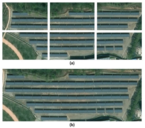 (a) Aerial images captured by drone; and (b) image of PV power station after image stitching.