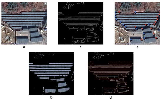 (a) Image from Google maps; (b) segmented image; (c) detected contours; (d) filtered contours; and (e) final image with markers.