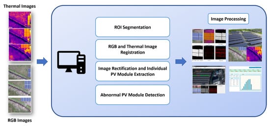 The proposed system uses the thermal image processing algorithm that was proposed in our previous study [18]. The overall block diagram for thermal image processing is visualized in Figure 8. This step is responsible for detecting faulty PV modules using image processing. Let and denote the images captured by the RGB and the thermal camera, respectively. Each step of the image processing algorithm is summarized below: