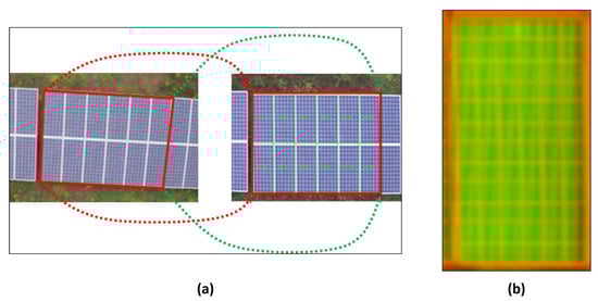 The resulting image from previous section is rectified for easier thermal distribution analysis. A sample illustration of image rectification is shown in Figure 10a. After image rectification, the individual PV modules are extracted by using the mask from Section 3.4.1. Particularly, the edges of the valid feature points and are used to extract the individual PV module area. An example of one of the extracted PV modules can be visualized in Figure 10b.