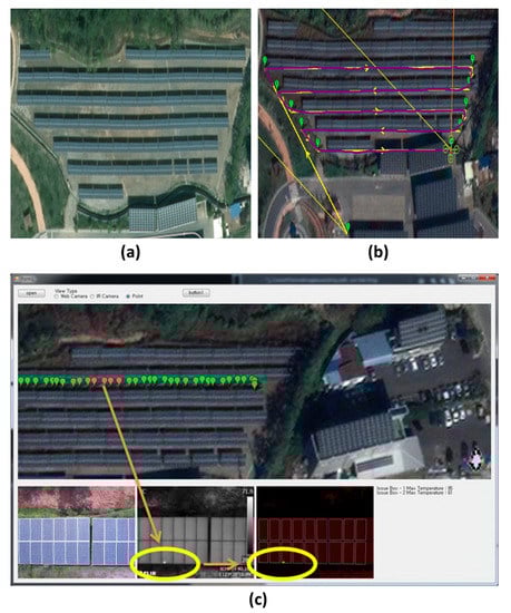 (a) Image of overall PV power plant; (b) image showing the automatically planned flight path; and (c) the final result showing the location of defective PV modules.