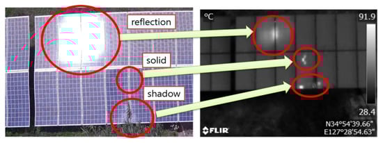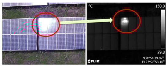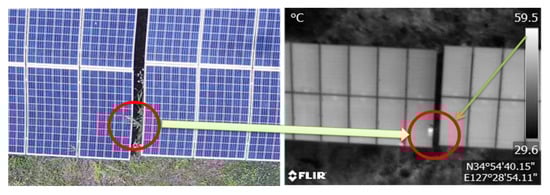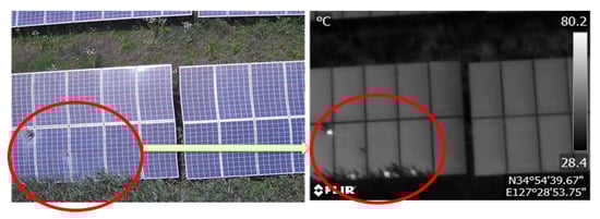 Figure 15 shows the region where the system detected a hot spot, but the reason was unidentifiable. Different types of defects or failures can be detected only at different heights. Moreover, characteristics of defects also play an important role in its detection. Therefore, further investigation is needed to perform more efficient identification of faults. Figure 16 shows another defective PV module, which was affected by various causes such as reflection, solid, and shadow. In addition, the exact geolocalization of deteriorated PV modules in large-scale plants is one of the most critical issues in PV plant inspection. In this work, we used GPS information to locate the faulty modules. Aluminum marks can be used for thermal images georeferencing due to its low emissivity nature, which facilitates in better pointing. However, for the precise location in large-scale plants with centimeter accuracy, a further survey on RTX modules needs to be performed. In conclusion, our experiments demonstrated that hot spots generally occur due to partial shading from weeds, solid things present on the surface of PV module, broken interconnects, and/or reflection from sunlight.