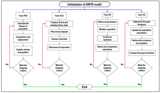 The flow chart of the proposed hybrid adaptive neuro-fuzzy inference system (ANFIS) model, the optimization procedure of each integrated nature-inspired algorithm.