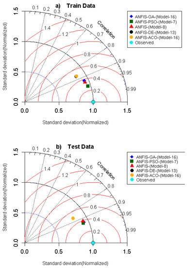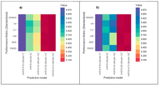To finalize the best relation between proposed models and the performance metrics, a heat map was created, where this diagram depicts the graphical comparison between models in term of standardized performance indices. It can be seen in Figure 3 that all the standardized performance indices of ANFIS-PSO (Model-7) have a dark blue color (best performance) in both training and testing phases, while ANFIS-ACO (Model-16) appeared to be the lowest in terms of these performance metrics (dark red color).