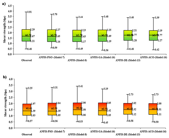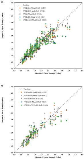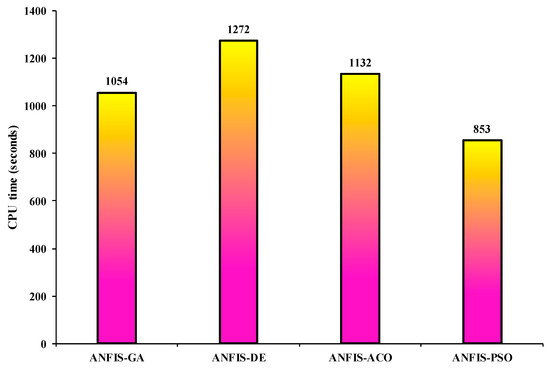 Previous studies confirmed that the standalone ANFIS is limited in solving complex problems due to trapping in local optimum results [95]. Besides, it requires a time-consuming process to tune the parameters of membership functions and fuzzy logic rules [96]. The combination of classical ANFIS with meta-heuristic optimization techniques inspired by nature can provide fast convergence speed while the trapping in of local optimum results can be tackled. The classical ANFIS includes two major sections as antecedent and consequent parts. Tuning the antecedent ( and in Equation (4)) and consequent (, and in Equation (7)) parameters is essential to obtain reliable solutions. The ANFIS uses gradient-based techniques to tune those parameters. The major disadvantage of these techniques is trapping in local optimum solutions. This study aims to tune ANFIS parameters (antecedent and consequent parameters) by several meta-heuristic optimization algorithms (e.g., PSO, GA, DE and ACO) according to following steps: