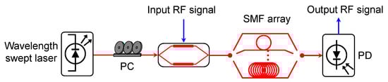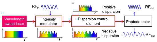 Figure 1 shows the working principle of the proposed microwave photonic frequency conversion system. A wavelength swept fiber laser (WSL) was used as the optical source. The output of the WSL was a series of long pulse trains, the wavelength of which changed linearly over time, periodically. The input microwave signal was then modulated to the WSL output by an optical intensity modulator in order to convert the microwave signal into the optical domain. During the intensity modulation process, the WSL pulse was shaped by the microwave signal, and the microwave signal voltage was converted to the optical intensity, as shown in Figure 1. The modulated optical signal was then injected into a dispersion control element (DCE). Due to the chromatic dispersion characteristic of the broadband WSL, different time delays were introduced to different wavelength components, and the pulse length of the modulated optical signal was stretched or compressed. At the output of the DCE, a photodetector (PD) was used to detect the optical intensity vibration, and the microwave signal was recovered from the optical domain. In this way, the microwave signal was also compressed or stretched, and the frequency of the loaded microwave signal drifted to a high or a low frequency. The direction of the pulse length change depended on whether the sign of the WSL chirp rate and the DCE index were the same or the opposite. When the sign of the WSL chirp rate and the DCE index were the same, the pulse was compressed and the input signal was up-converted. Otherwise, the pulse was stretched and the input signal was down-converted. The compression rate of the optical pulse depended on the time delay, which could be calculated by the dispersion of the DCE and the optical bandwidth of the WSL.