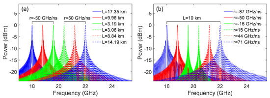 In the simulation, the input frequency was 20 GHz and the conversion coefficient κ was increasing from 0.9 to 1.1 in steps of 0.04. Figure 2a shows the trend of the Sinc function when only L changed and the absolute value of r was fixed at 50 GHz/ns. The conversion direction was achieved by switching the sign of r. The tuning of L was achieved by switching different channels of the optical fiber array. When L changed, the center frequency of the Sinc function was shifted from 18 GHz to 22 GHz and the 3-dB bandwidth remained the same. Figure 2b shows the trend of the Sinc function when L was fixed at 10 km and r was tuned from −87 GHz/ns to 71 GHz/ns. The tuning of r can be achieved by the dispersion control element or the wavelength sweeping component in the cavity of the WSL. The center frequency shift of the Sinc function was the same as when L was tuned. However, the 3-dB bandwidth was narrower when κ was closer to 1 and became larger when κ moved away from 1. Thus, the tuning of κ by changing L was more reliable compared with changing r, especially when the frequency shifting range was large. On the other hand, a smaller chirp rate r introduced a larger suppression to the sidemodes, as the summation term in (7) describes. Thus, the influence of the pulse repetition frequency ωr should also be noted.