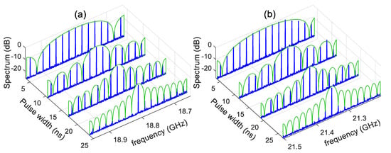 The pulse repetition frequency ωr determined the frequency shift accuracy of conversion system because of the discrete nature of the pulse signal. For the fixed repetition angular frequency ωr and conversion coefficient κ, increasing τ could have significantly narrowed the Sinc function, the sidemodes were suppressed and there was the dominant mode. Figure 3 shows the down-conversion simulation spectra (input: 20 GHz; output: 18.8 GHz) and the up-conversion simulation spectra (input: 20 GHz; output: 21.4 GHz) when ωr was set to be 20 MHz and τ was increasing.