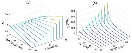 Theoretically, r and L had the same effect on κ as (7) described, but their value range was limited in practice. For example, too long an SMF introduced a significant decay of the optical loss. Figure 4a shows the influence of r and L on the conversion coefficient κ. For a fixed L, κ almost changed linearly with r at the range of −50 GHz/ns to 50 GHz/ns. For a fixed r, κ decreased linearly with L when r was negative, and increased nonlinearly with L when r was positive. Thus, the system’s up-conversion efficiency is higher than its down-conversion efficiency. Figure 4b shows the maximum value for ωr and that only one main-mode can exist at the certain Δω and r. Here, ωr can be considered as the conversion accuracy. For a fixed Δω, ωr changed linearly with r. For a fixed r, ωr dropped sharply with Δω, even when r was high (a lower r reduced κ). Combined with Figure 4a,b, to improve the efficiency of κ and reduce the frequency shift interval ωr, a large WSL bandwidth Δω and large chirp rate r should be used.