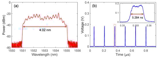 Figure 6a shows the optical spectrum of the WSL, measured by an optical spectrum analyzer (OSA, YOKOGAWA, AQ6370C, Tokyo, Japan). The center wavelength and bandwidth of the WSL were 1553 nm and 4.02 nm, respectively. Figure 6b shows the time domain WSL pulse train and the detailed waveform that was directly detected by the PD and the oscilloscope. The chirp rate of the WSL was ± 99.6 GHz/ns and the repetition frequency was 6.7 MHz. The waveform of a single pulse was approximately rectangular, with a pulse width of about 5.284 ns, as shown in the insert figure. Due to the limitations of current laboratory conditions, the duty cycle was calculated to be 3.5%, which was much lower than the simulated single mode condition. In future works, an MLL with a large duty cycle needs to be researched in order to meet the requirements of the previous part of the system simulation. Figure 7 shows the time domain pulse waveform and the electrical spectrum of the frequency down-conversion system (r = −99.6 GHz/ns), with a different SMF length when the input frequency was 5 GHz.