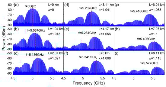 (a–i) The electrical spectrum of the up conversion when the SMF was 0 km, 1.04 km, 2.07 km, 3.11 km, 4.17 km, 5 km, 6.04 km, 7.07 km and 8.11 km.