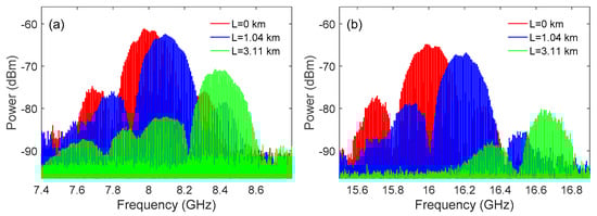 (a) The up-conversion spectrum for the 8 GHz input signal with different SMF lengths; (b) the up-conversion spectrum for the 16 GHz input signal with different SMF lengths.
