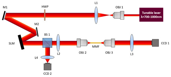 The optical setup built to collect the datasets for training the DNNs is shown in Figure 1. The beam of a wavelength-tunable laser source (M-squared, SolsTiS 2000 PSX XF with Terascan software), emitting in the range 700–1000 nm is used to illuminate a graded-index (GRIN) MMF with 62.5 μm core diameter and numerical aperture (NA) of 0.275 (GIF625, Thorlabs GmbH, Germany). The wavelength of the laser source can be tuned with 10 fm accuracy. GRIN fibers are often used to avoid temporal distortion in a signal due to modal dispersion. A beam expansion is achieved by a set of lenses (L1: f = 200 mm, OBJ1: 10×, Newport, Irvine, CA, USA) placed at the laser output to ensure that the beam size is large enough to illuminate optimally a phase-only spatial light modulator (SLM, 1920 × 1080 pixels, Pluto-Vis, Holoeye, Berlin, Germany). The SLM is used to display the desired patterns and the SLM plane is imaged onto the proximal facet of the MMF by means of a 4f imaging system (lens L2: f = 400 mm, microscope objective OBJ2: 60x, Newport, Irvine, CA, USA). Another 4f system (the same as the proximal one, L3-OBJ3) magnifies the speckle pattern emerging from the distal facet on a CCD camera (CCD, Chameleon 3, 1024 × 1280 pixels, Mono, Point Grey). An additional lens (L4: f = 200 mm) in 2f configuration allows monitoring the images generated by the SLM on a second camera at the proximal side (CCD2). A halfwave plate is placed before the SLM to ensure that the correct polarization of illumination is used (see Figure 1). The fiber length used in the experiments is 10 cm.