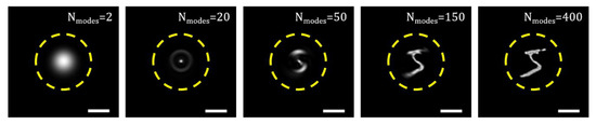 Decomposition of images in cases of different numbers of supported fiber modes. The size of the input images was approximately 100 × 100 pixels.