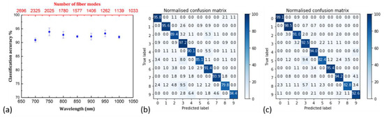 Phase-encoded images of handwritten digits from the MNIST database are projected by the SLM on the GRIN fiber facet, and the corresponding intensity images of the resulted speckle patterns are collected. We collect datasets for different wavelengths covering the range of the tunable laser ranging from 700 to 1000 nm with a 50 nm increment. The classification accuracy of the system is determined by training the VGG DNN for each case [30,31]. The training and test set consist of images captured at a single wavelength, without any drift during recording, for this preliminary assessment. It has been shown in our previous work that with increasing fiber length, slight environmental perturbations can cause severe speckle drifts [16]. For the 10-cm long GRIN fiber used in the experiments, no further instabilities because of mechanical or thermal changes are observed. In Figure 4a, the average classification accuracy obtained at the different wavelengths is presented together with the normalized confusion matrices for the two ends of the wavelength range, namely 700 nm (Figure 4b) and 1000 nm (Figure 4c). No significant change in the classification accuracy is observed for the datasets across the studied range. Hence, we can assume that the total number of spatial modes supported within this wavelength scanning range is sufficient to represent the input information and it does not affect the performance of the VGG classifier.