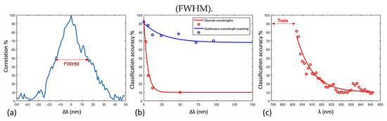 Until this point, we have discussed the aspect of training a DNN algorithm to recover information through a MMF system despite the wavelength changes by including the noise in the dataset. Nevertheless, there are cases where sensitivity in the wavelength change is actually crucial; for example, MMFs have been proposed as suitable systems for high-resolution spectrometers [34,35]. In those previous works, the speckle decorrelation with wavelength is used for distinguishing different wavelengths and the resolution is dependent on the speckle decorrelation bandwidth of the specific fiber, which becomes narrower with increases in the fiber length. In the results presented in this work, we observed that the classification efficiency of a trained DNN with data recorded at a single wavelength is sensitive to wavelength changes and deteriorates within a significantly narrower bandwidth (Figure 5b, red circles) than the decorrelation bandwidth of the system (Figure 5a). Therefore, what is considered unwanted for information recovery through the system under a wavelength drift situation, it could potentially be desired for achieving a resolution which is higher than the one given by the decorrelation bandwidth and has been previously proposed in the literature for spectroscopic applications.